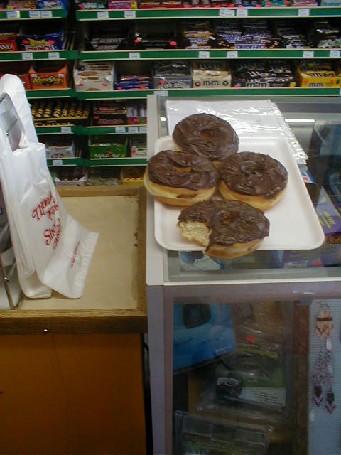 Meanwhile, as we were oo-ing and awe-ing, a woman in the deli and bakery across the street fried up a batch of thickly chocolate iced donuts just for us. You can imagine our pleasure and full mouths.