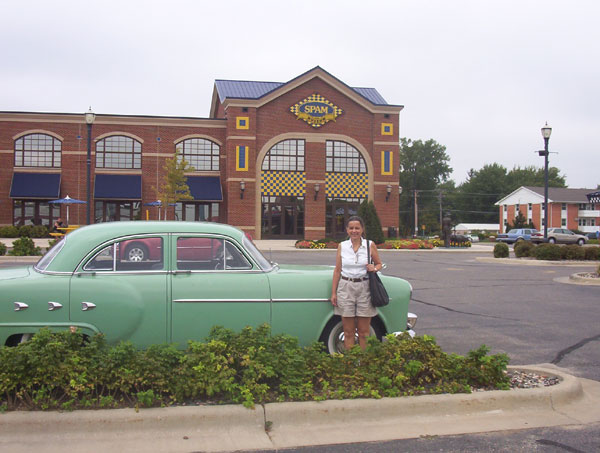 After a short drive we picked up our Plucky Passenger for the trip (we pause here to salute last year’s Plucky Passenger, Jessica, who wishes to remind us all she was the first such Plucky Rider), Plucky Sister Deborah. She and her beau Dave live in Stoddard, WI, and drove to meet us at the Spam Museum, a long drive for them early in the morning. Thanks to Dave for making the drive and being part of the Plucky Caravan (in his vintage 1952 Packard, the envy of many car buffs) because it allowed Deb to come along with us in Plucky Mobile.