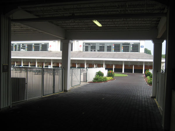 The paddock in the background and the famed tunnel in which the horses make their way to the track.