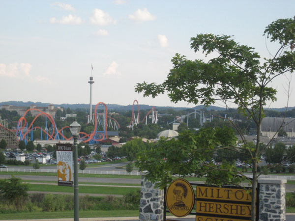Tonight we are ensconced in a Days Inn smack dab on Chocolate Avenue in the center town, in fact the closest of any hotel to the parks. Sure it’s a chain but rooms are generously sized, they come with a microwave and a mini-fridge, and service at the front desk is top notch. Upon checking in a receptionist hands you several sheets of paper loaded with suggestions for nearby restaurants (for which they have menus) and other helpful hints. They also provide a free and prompt shuttle to all Hershey attractions, an indoor pool, a fitness center, laundry facilities, and free parking, which considering the $36 per night valet only parking charges we’ve been racking up, we’re very happy about.